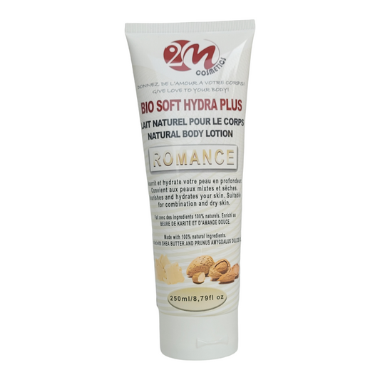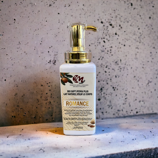 Lait corporel BIO SOFT HYDRA PLUS ROMANCE enrichi au KARITÉ et AMANDE DOUCE 250 ml : "Offrez à votre peau une douceur envoûtante. Formule luxueuse et 100% naturelle pour une hydratation intense et une peau parfaitement nourrie"
